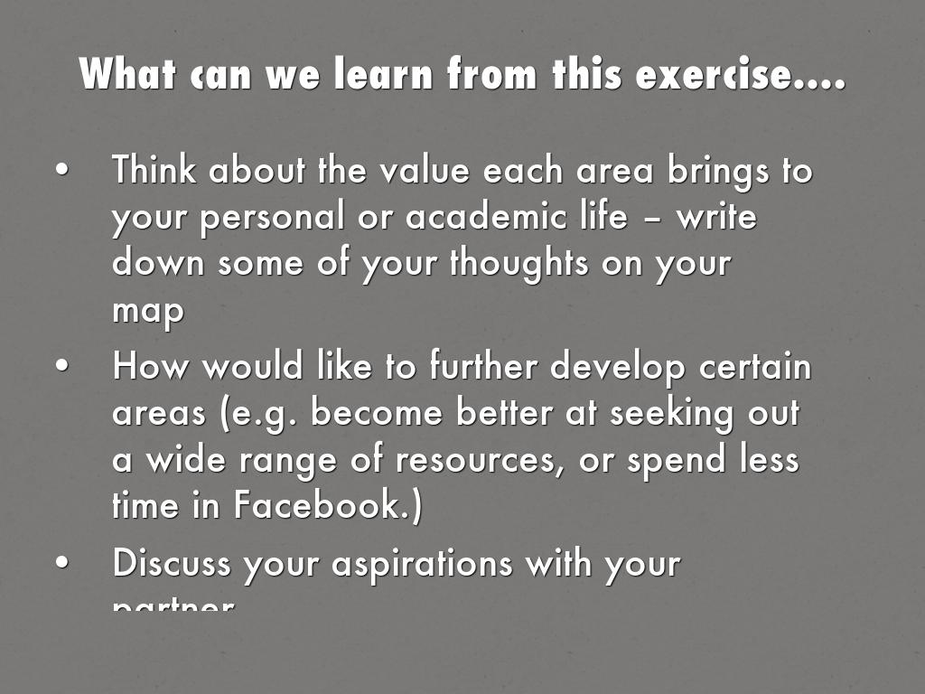 Think about the value each area brings to your personal or academic life – write down some of your thoughts on your map