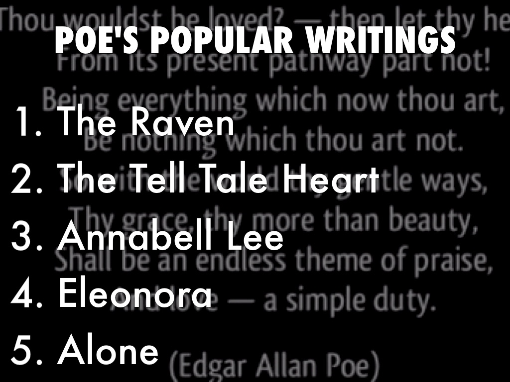Some books he wrote was the raven, the tell tale heart, and annabell lee.