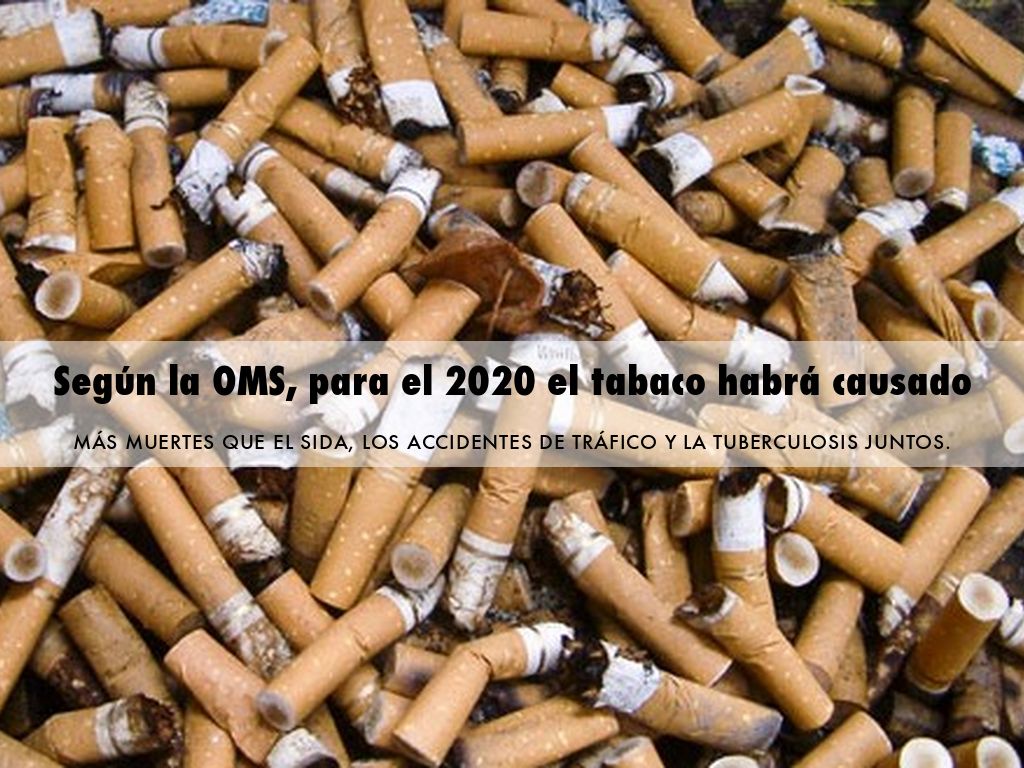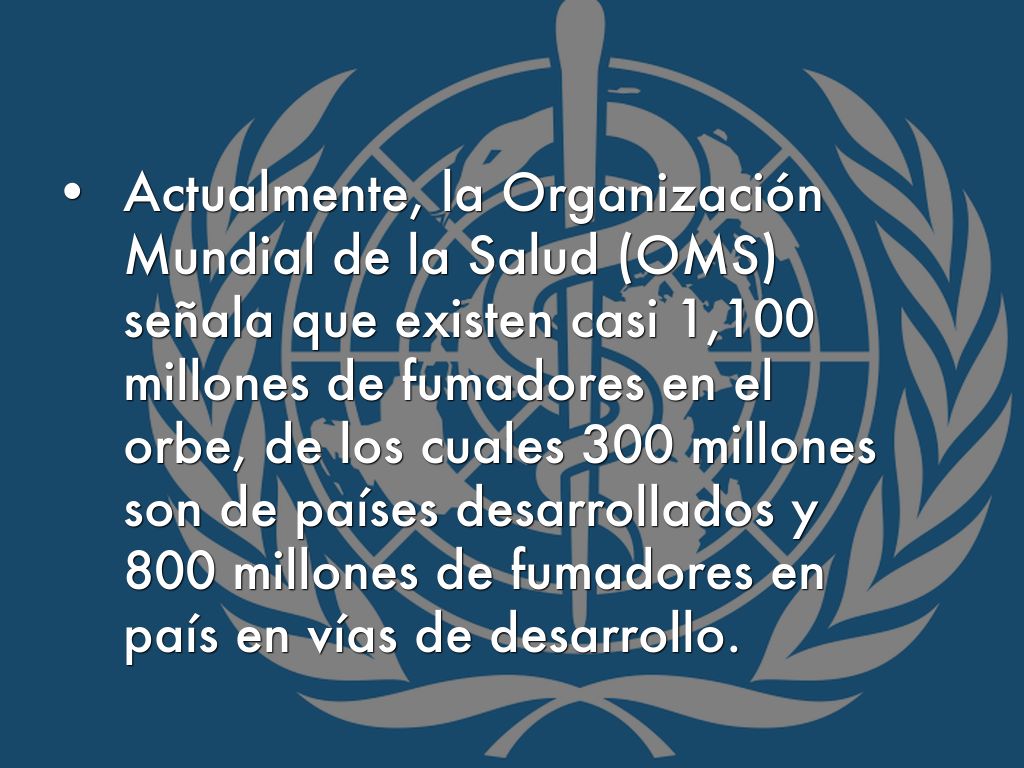 • Actualmente, la Organización Mundial de la Salud (OMS) señala que existen casi 1,100 millones de fumadores en el orbe, de los cuales 300 millones son de países desarrollados y 800 millones de fumadores en país en vías de desarrollo.