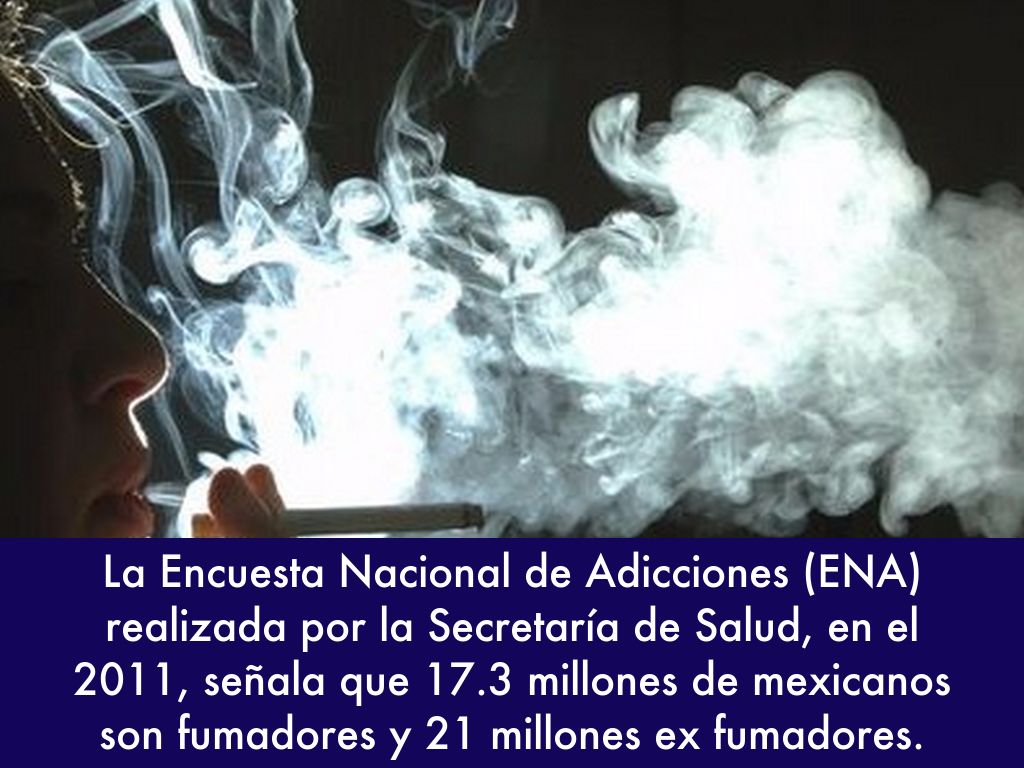 La Encuesta Nacional de Adicciones (ENA) realizada por la Secretaría de Salud, en el 2011, señala que 17.3 millones de mexicanos son fumadores y 21 millones ex fumadores.