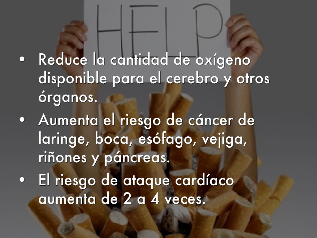 • Aumenta el riesgo de cáncer de laringe, boca, esófago, vejiga, riñones y páncreas.