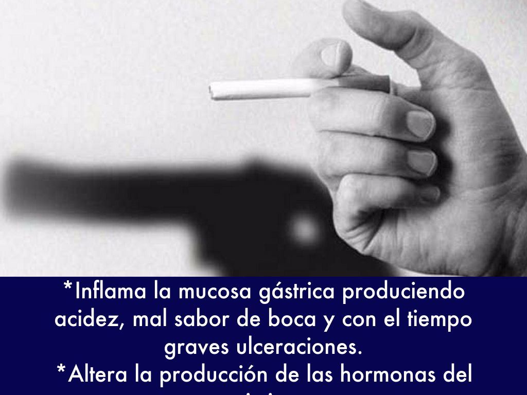 *Inflama la mucosa gástrica produciendo acidez, mal sabor de boca y con el tiempo graves ulceraciones.