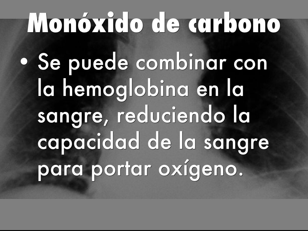 • Se puede combinar con la hemoglobina en la sangre, reduciendo la capacidad de la sangre para portar oxígeno.