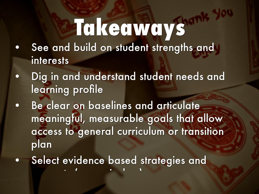 Be clear on baselines and articulate meaningful, measurable goals that allow access to general curriculum or transition plan