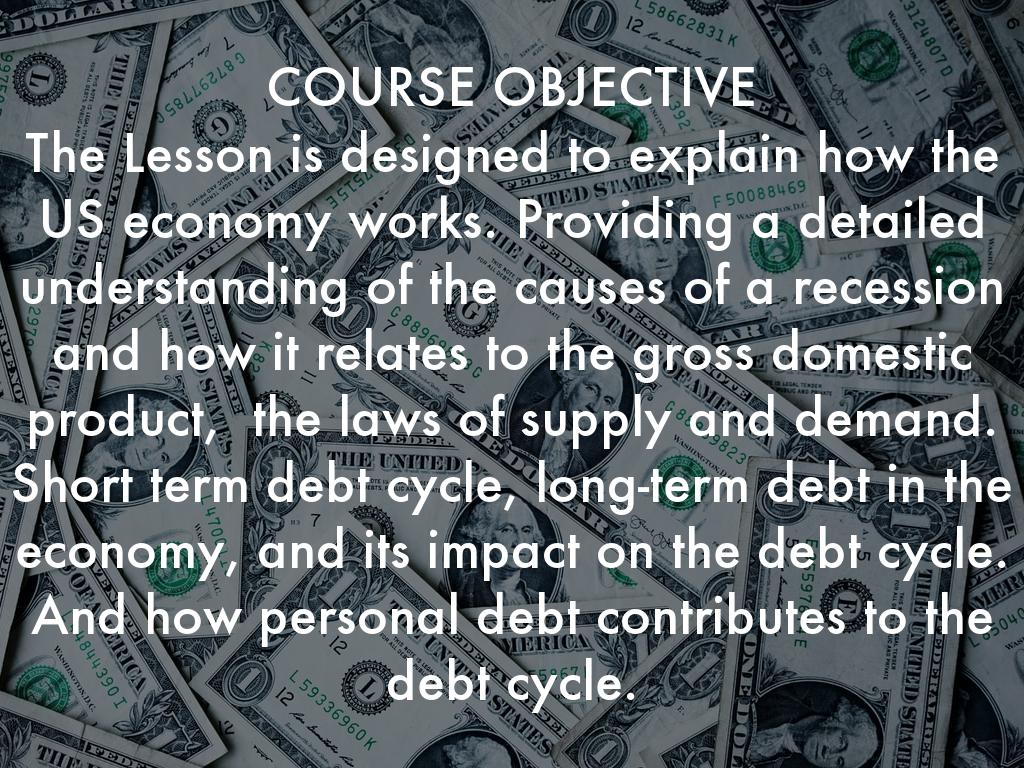 COURSE OBJECTIVE The Lesson is designed to explain how the US economy works. Providing a detailed understanding of the causes of a recession and how it relates to the gross domestic product, the laws of supply and demand. Short term debt cycle, long-term debt in the economy, and its impact on the debt cycle. And how personal debt contributes to the debt cycle.