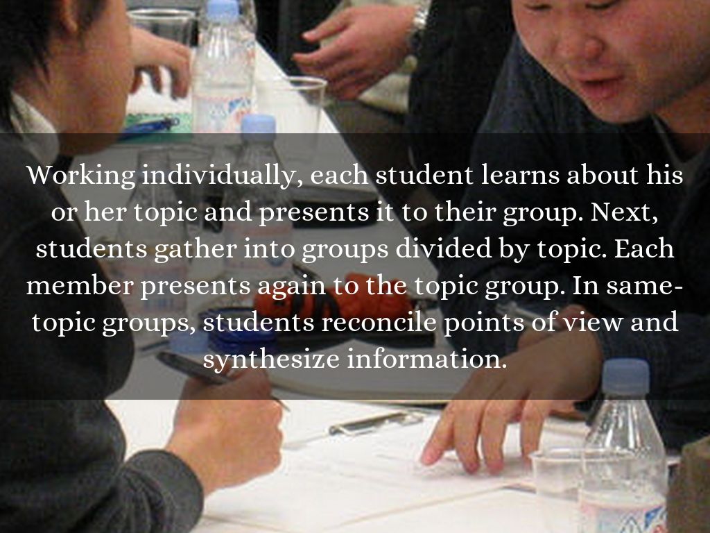 Working individually, each student learns about his or her topic and presents it to their group. Next, students gather into groups divided by topic. Each member presents again to the topic group. In same-topic groups, students reconcile points of view and synthesize information.