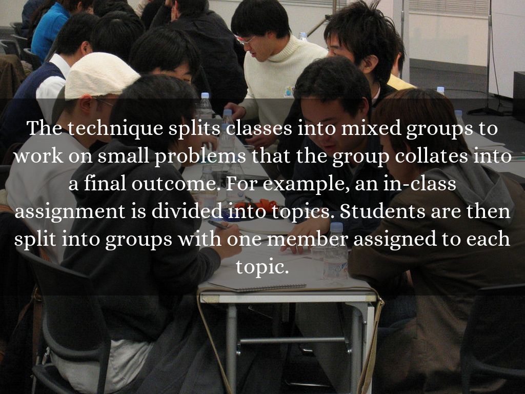 The technique splits classes into mixed groups to work on small problems that the group collates into a final outcome. For example, an in-class assignment is divided into topics. Students are then split into groups with one member assigned to each topic.
