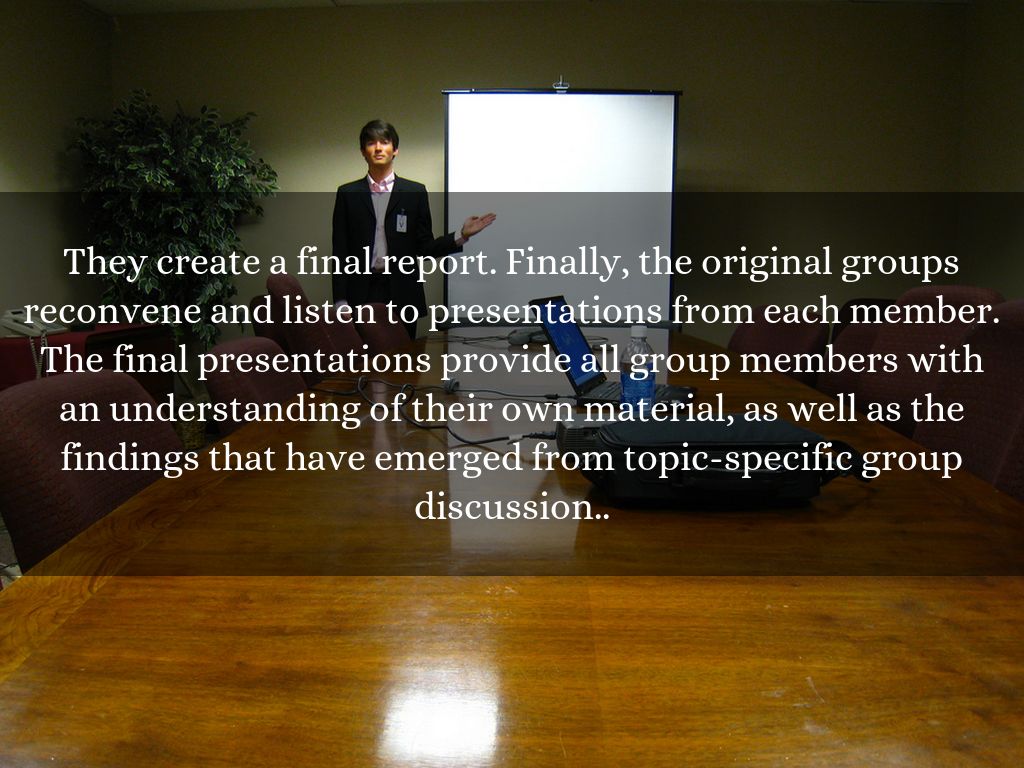 They create a final report. Finally, the original groups reconvene and listen to presentations from each member. The final presentations provide all group members with an understanding of their own material, as well as the findings that have emerged from topic-specific group discussion..