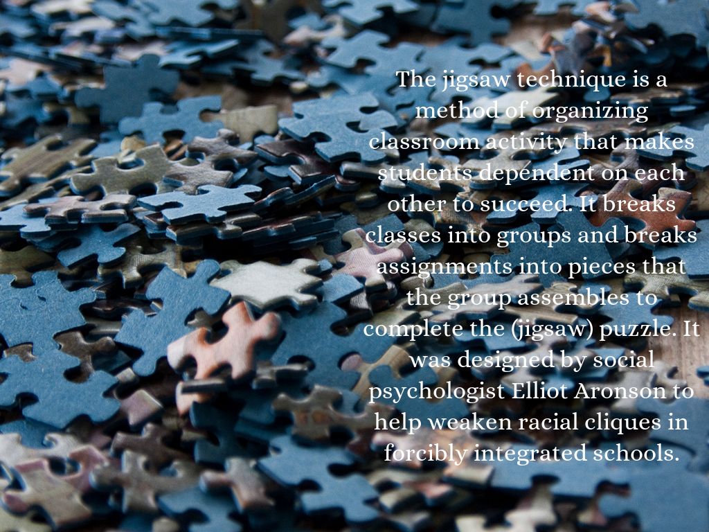 The jigsaw technique is a method of organizing classroom activity that makes students dependent on each other to succeed. It breaks classes into groups and breaks assignments into pieces that the group assembles to complete the (jigsaw) puzzle. It was designed by social psychologist Elliot Aronson to help weaken racial cliques in forcibly integrated schools.