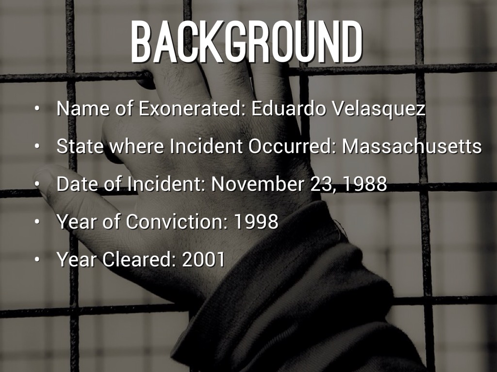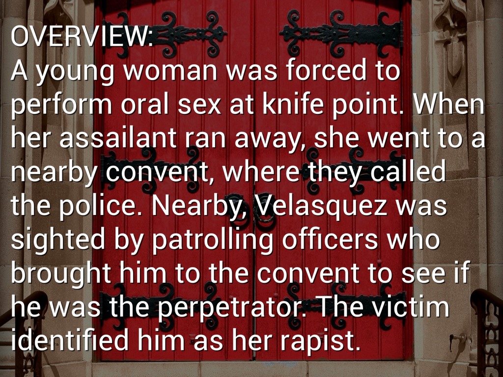 A young woman was forced to perform oral sex at knife point. When her assailant ran away, she went to a nearby convent, where they called the police. Nearby, Velasquez was sighted by patrolling officers who brought him to the convent to see if he was the perpetrator. The victim identified him as her rapist.