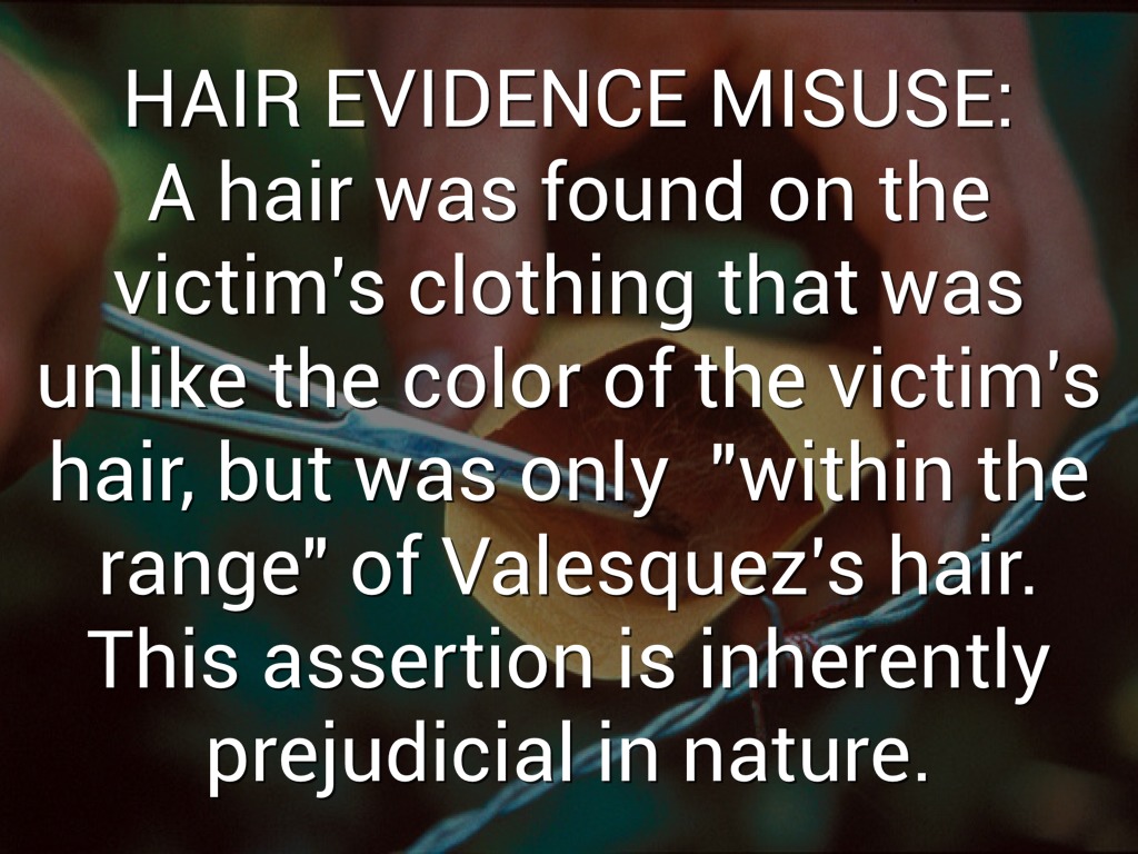 A hair was found on the victim's clothing that was unlike the color of the victim's hair, but was only "within the range" of Valesquez's hair. This assertion is inherently prejudicial in nature.