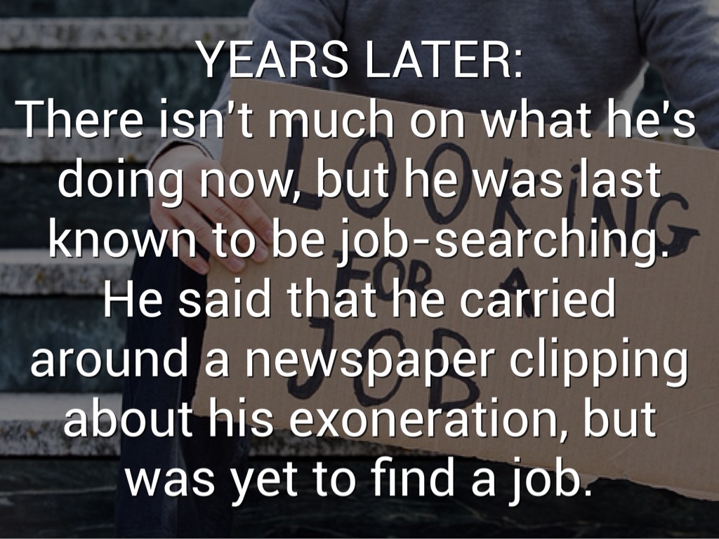 There isn't much on what he's doing now, but he was last known to be job-searching. He said that he carried around a newspaper clipping about his exoneration, but was yet to find a job.