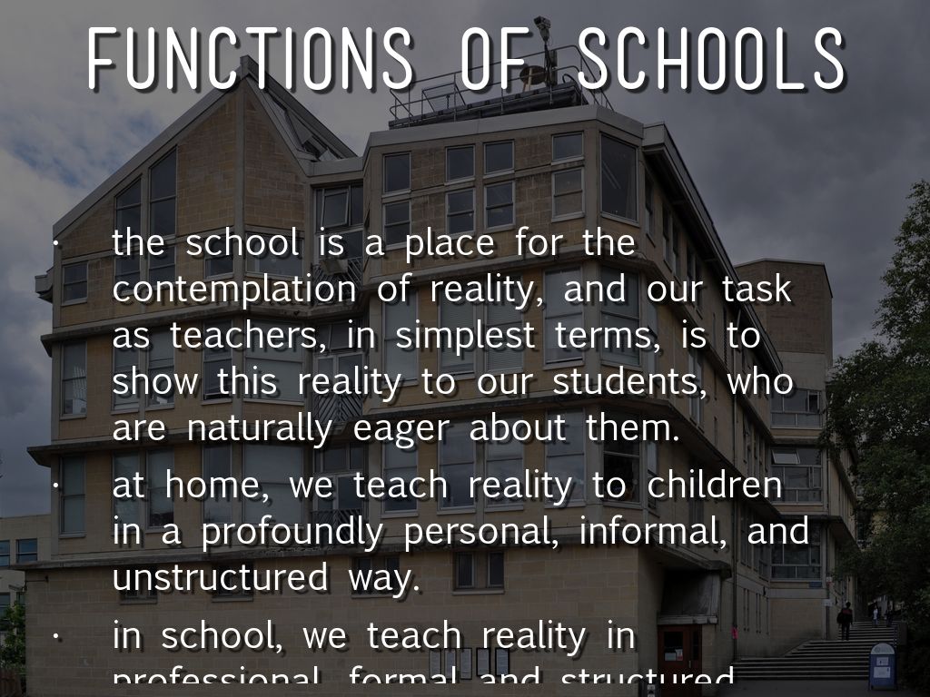the school is a place for the contemplation of reality, and our task as teachers, in simplest terms, is to show this reality to our students, who are naturally eager about them.