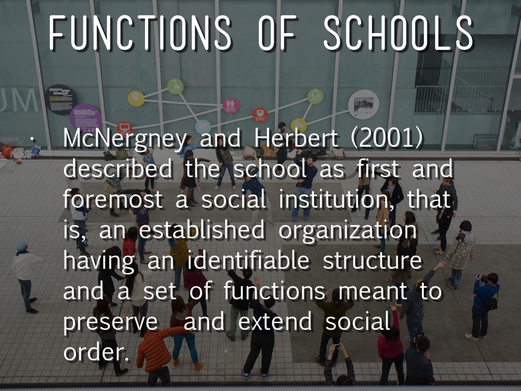 McNergney and Herbert (2001) described the school as first and foremost a social institution, that is, an established organization having an identifiable structure and a set of functions meant to preserve and extend social order.