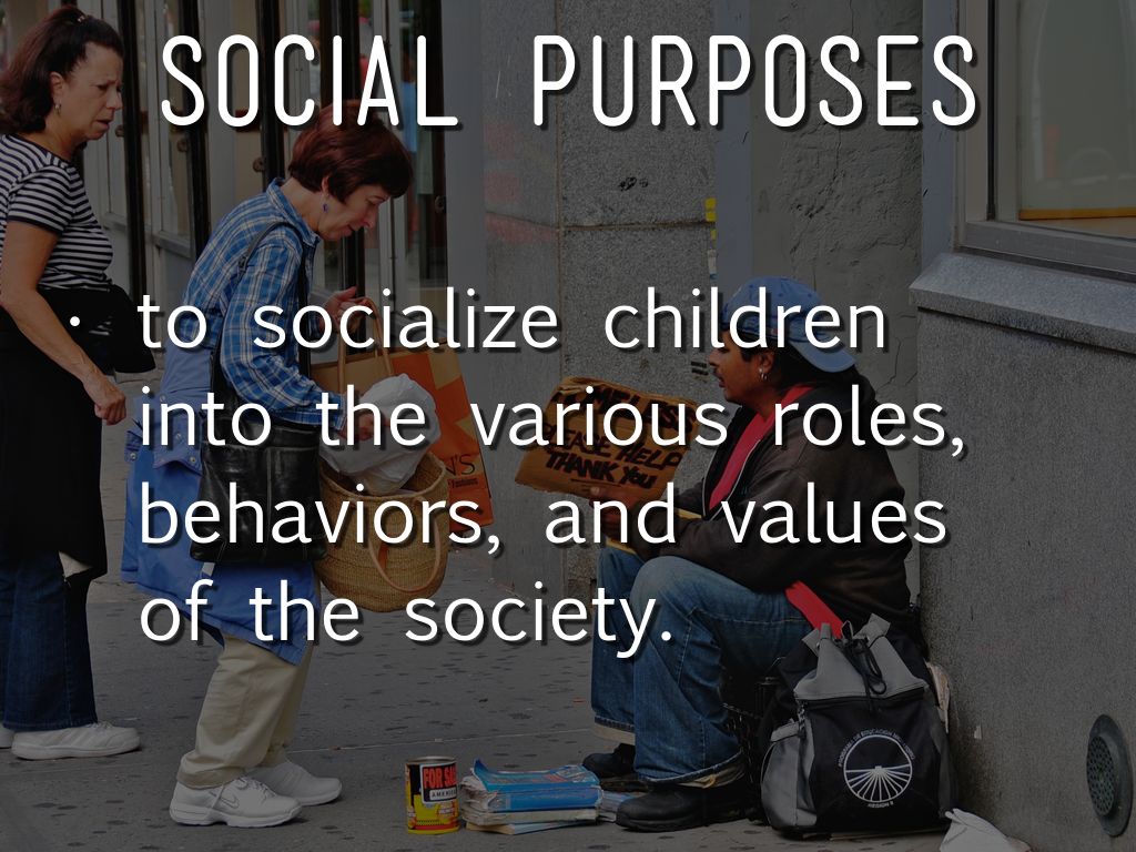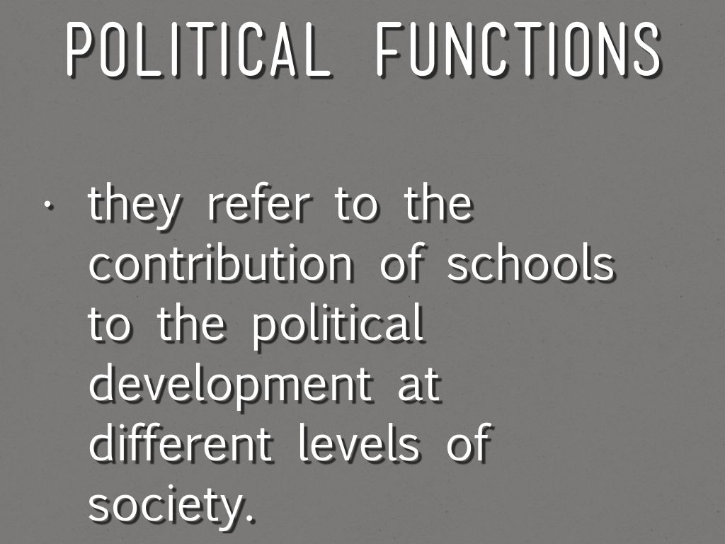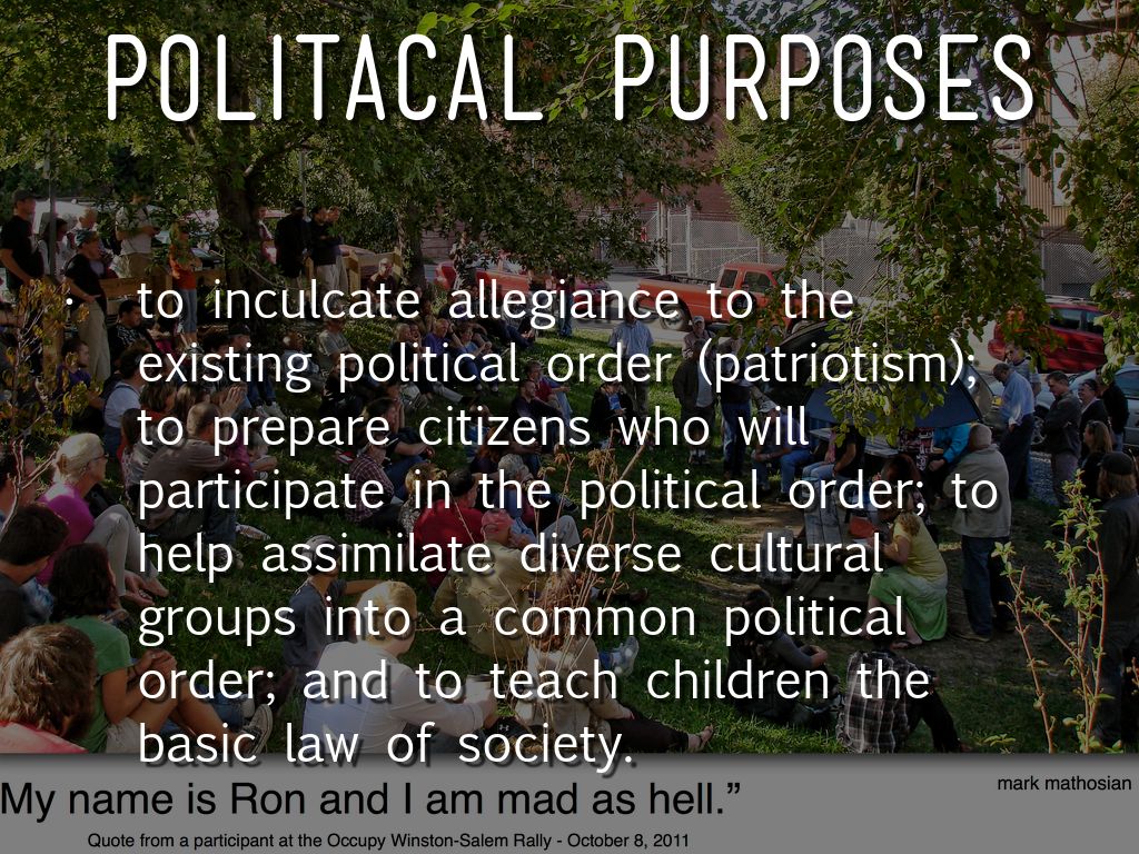 to inculcate allegiance to the existing political order (patriotism); to prepare citizens who will participate in the political order; to help assimilate diverse cultural groups into a common political order; and to teach children the basic law of society.