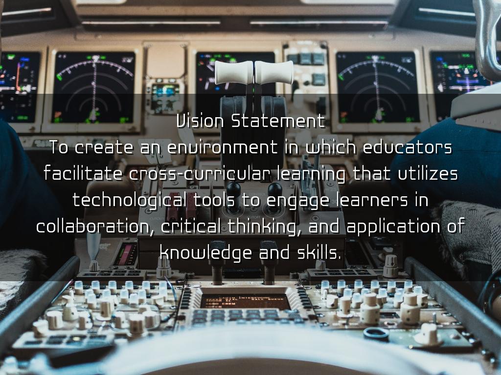 Vision Statement To create an environment in which educators facilitate cross-curricular learning that utilizes technological tools to engage learners in collaboration, critical thinking, and application of knowledge and skills.