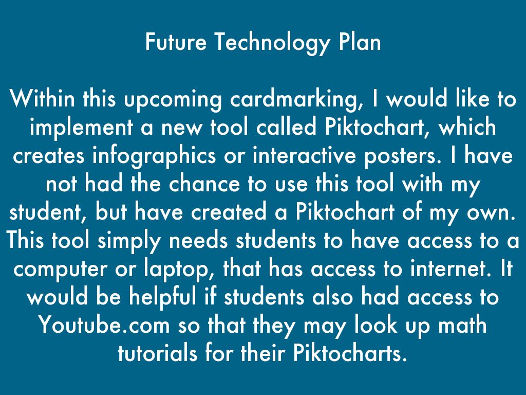 Within this upcoming cardmarking, I would like to implement a new tool called Piktochart, which creates infographics or interactive posters. I have not had the chance to use this tool with my student, but have created a Piktochart of my own. This tool simply needs students to have access to a computer or laptop, that has access to internet. It would be helpful if students also had access to Youtube.com so that they may look up math tutorials for their Piktocharts.