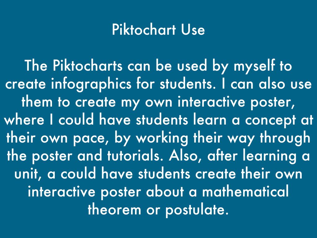 The Piktocharts can be used by myself to create infographics for students. I can also use them to create my own interactive poster, where I could have students learn a concept at their own pace, by working their way through the poster and tutorials. Also, after learning a unit, a could have students create their own interactive poster about a mathematical theorem or postulate.