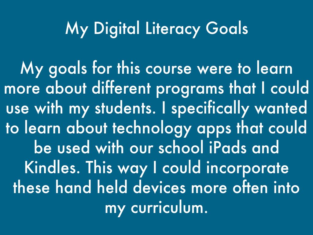 My goals for this course were to learn more about different programs that I could use with my students. I specifically wanted to learn about technology apps that could be used with our school iPads and Kindles. This way I could incorporate these hand held devices more often into my curriculum.