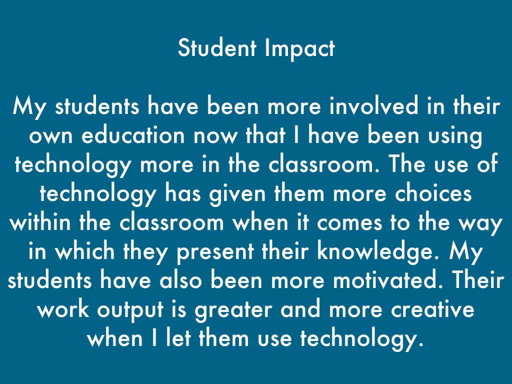 My students have been more involved in their own education now that I have been using technology more in the classroom. The use of technology has given them more choices within the classroom when it comes to the way in which they present their knowledge. My students have also been more motivated. Their work output is greater and more creative when I let them use technology.