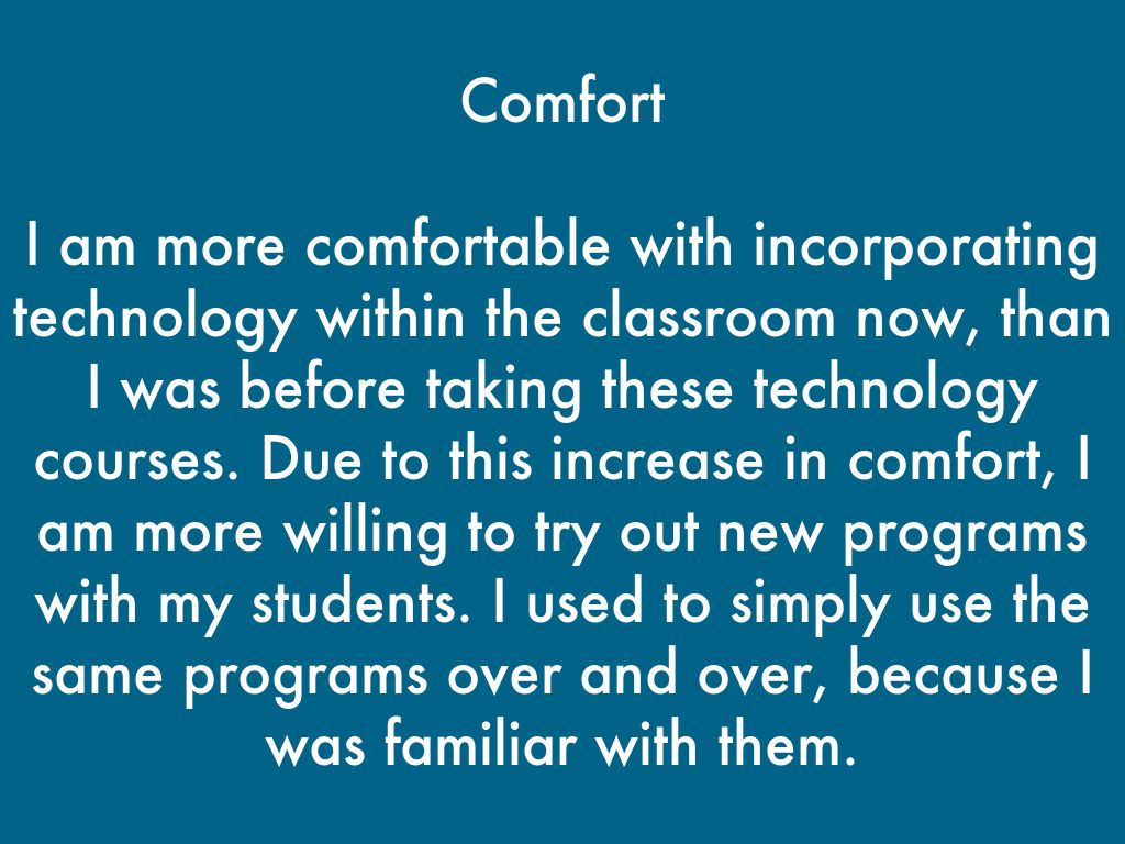 I am more comfortable with incorporating technology within the classroom now, than I was before taking these technology courses. Due to this increase in comfort, I am more willing to try out new programs with my students. I used to simply use the same programs over and over, because I was familiar with them.