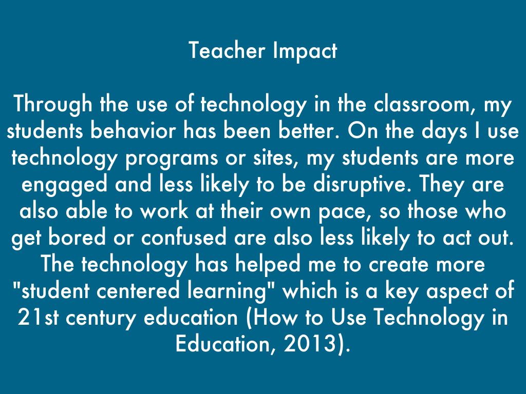 Through the use of technology in the classroom, my students behavior has been better. On the days I use technology programs or sites, my students are more engaged and less likely to be disruptive. They are also able to work at their own pace, so those who get bored or confused are also less likely to act out. The technology has helped me to create more "student centered learning" which is a key aspect of 21st century education (How to Use Technology in Education, 2013).