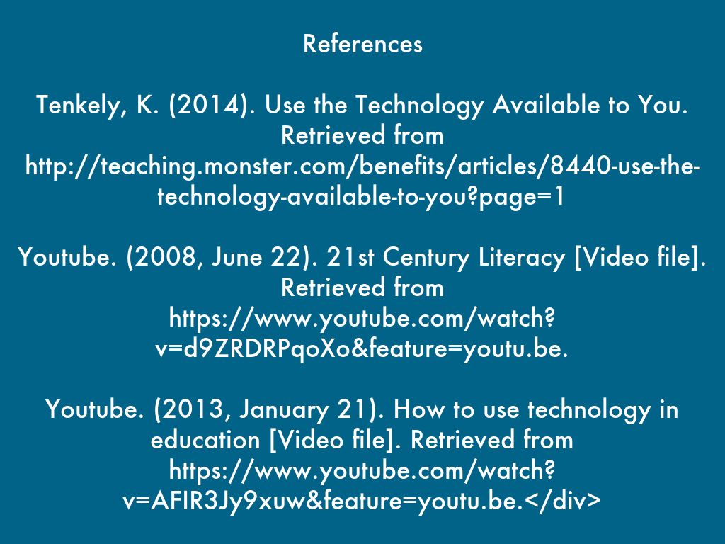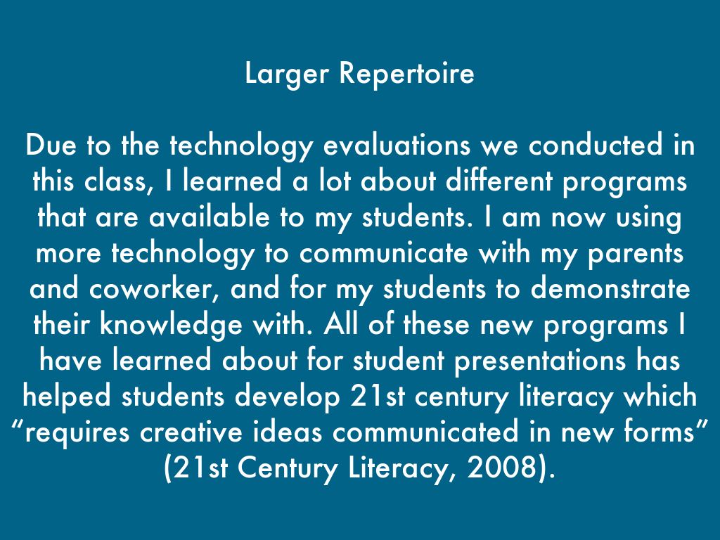 Due to the technology evaluations we conducted in this class, I learned a lot about different programs that are available to my students. I am now using more technology to communicate with my parents and coworker, and for my students to demonstrate their knowledge with. All of these new programs I have learned about for student presentations has helped students develop 21st century literacy which “requires creative ideas communicated in new forms” (21st Century Literacy, 2008).