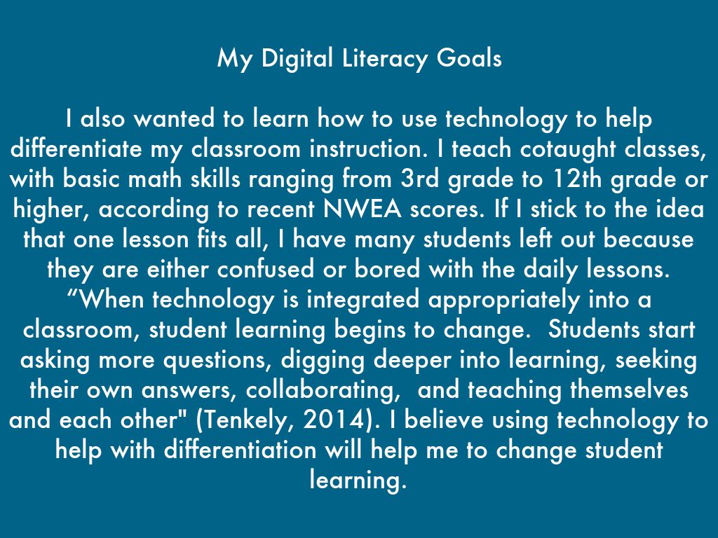 I also wanted to learn how to use technology to help differentiate my classroom instruction. I teach cotaught classes, with basic math skills ranging from 3rd grade to 12th grade or higher, according to recent NWEA scores. If I stick to the idea that one lesson fits all, I have many students left out because they are either confused or bored with the daily lessons. “When technology is integrated appropriately into a classroom, student learning begins to change. Students start asking more questions, digging deeper into learning, seeking their own answers, collaborating, and teaching themselves and each other" (Tenkely, 2014). I believe using technology to help with differentiation will help me to change student learning.