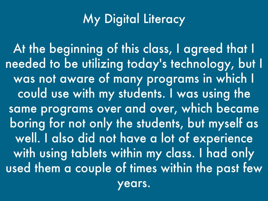 At the beginning of this class, I agreed that I needed to be utilizing today's technology, but I was not aware of many programs in which I could use with my students. I was using the same programs over and over, which became boring for not only the students, but myself as well. I also did not have a lot of experience with using tablets within my class. I had only used them a couple of times within the past few years.