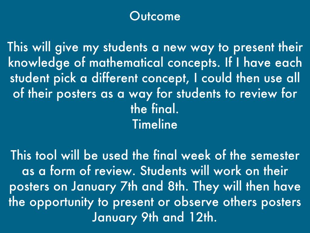This will give my students a new way to present their knowledge of mathematical concepts. If I have each student pick a different concept, I could then use all of their posters as a way for students to review for the final.