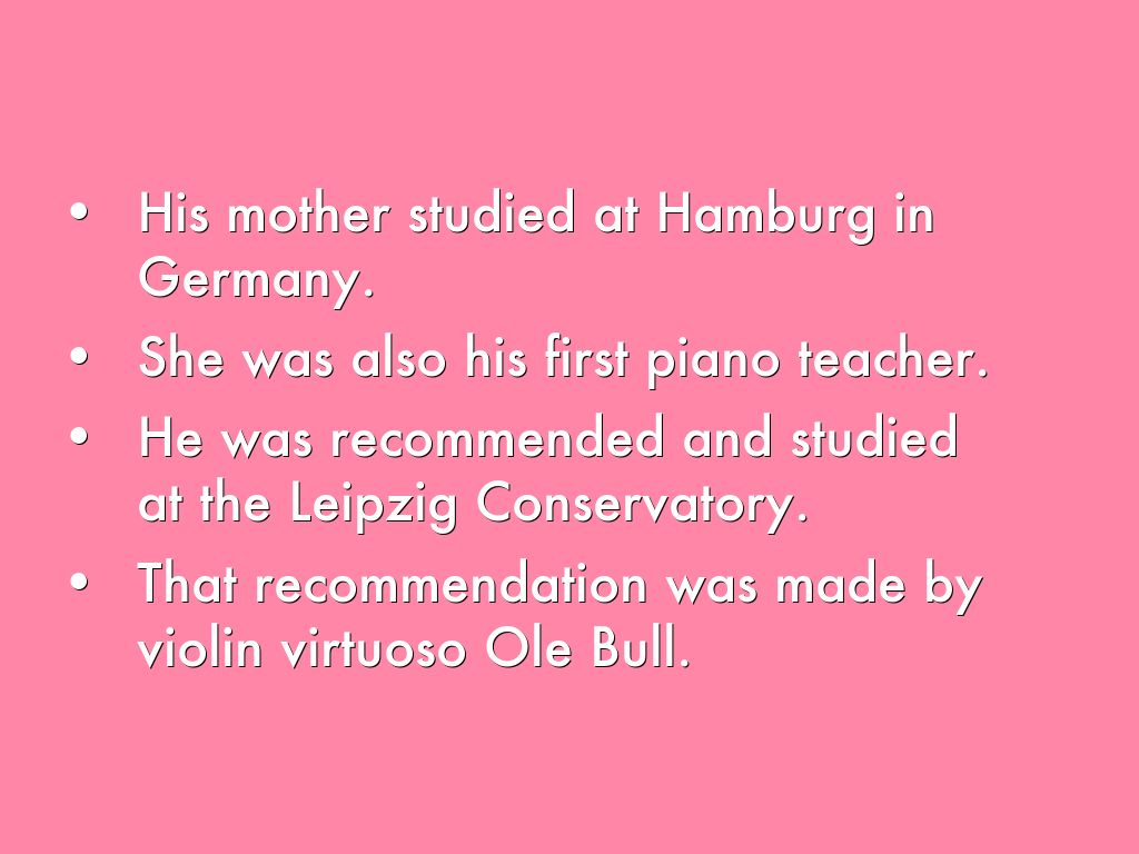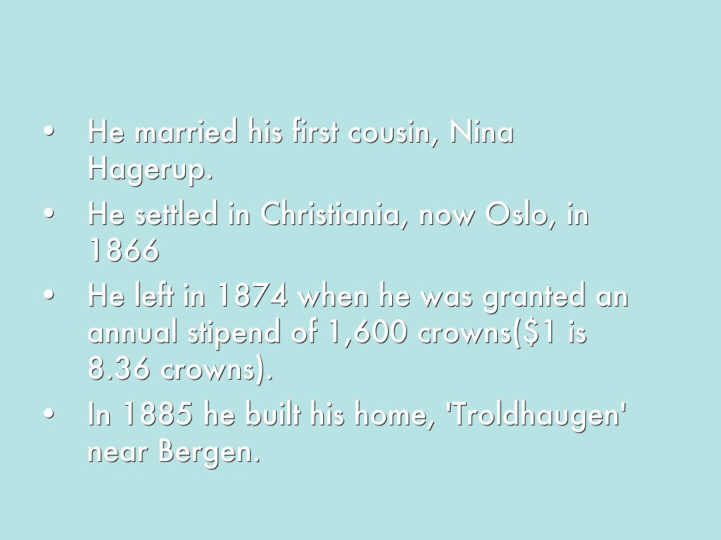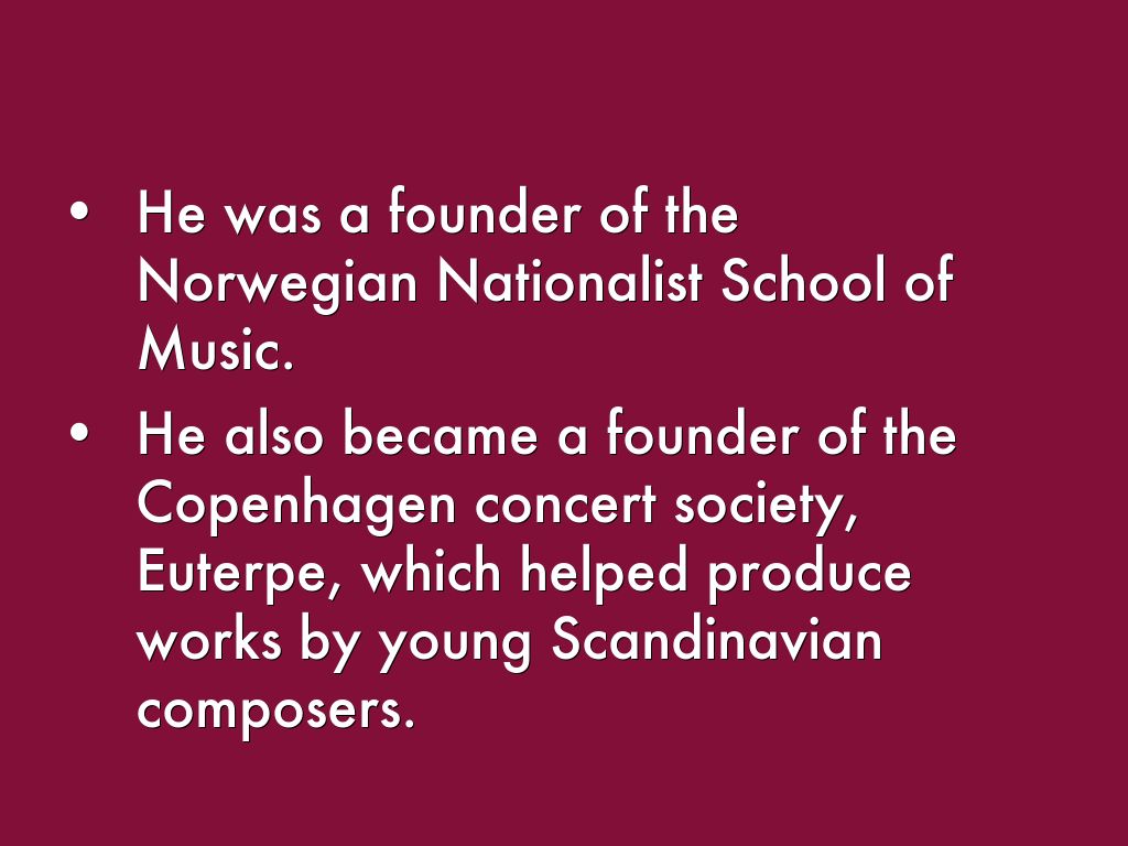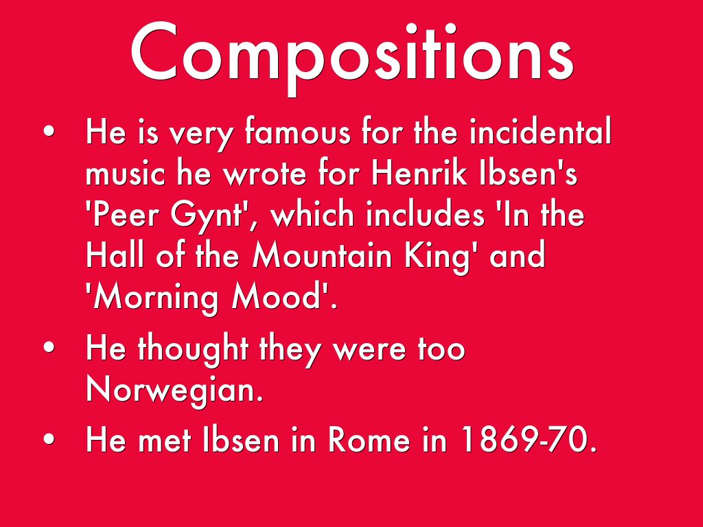 He is very famous for the incidental music he wrote for Henrik Ibsen's 'Peer Gynt', which includes 'In the Hall of the Mountain King' and 'Morning Mood'.