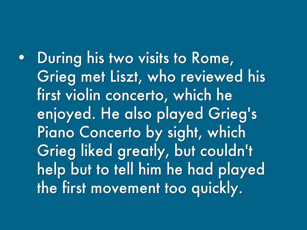 During his two visits to Rome, Grieg met Liszt, who reviewed his first violin concerto, which he enjoyed. He also played Grieg's Piano Concerto by sight, which Grieg liked greatly, but couldn't help but to tell him he had played the first movement too quickly.