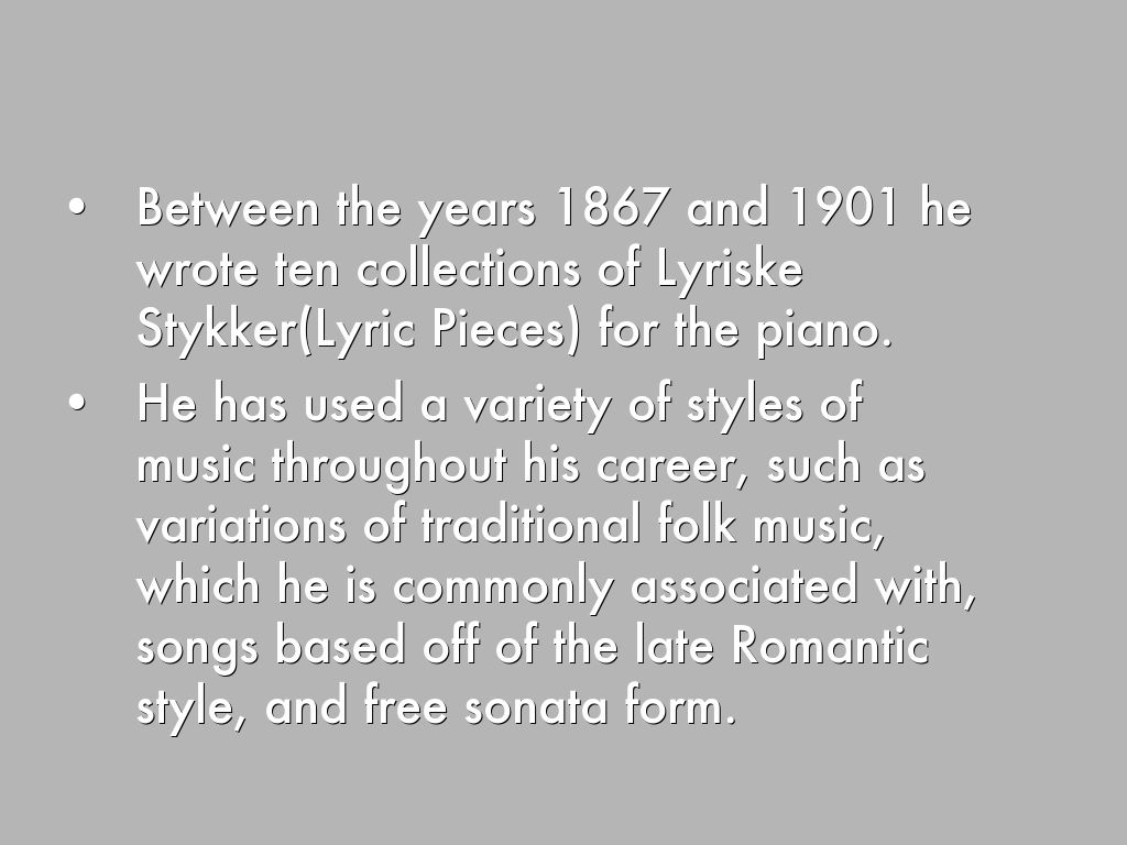 Between the years 1867 and 1901 he wrote ten collections of Lyriske Stykker(Lyric Pieces) for the piano.
