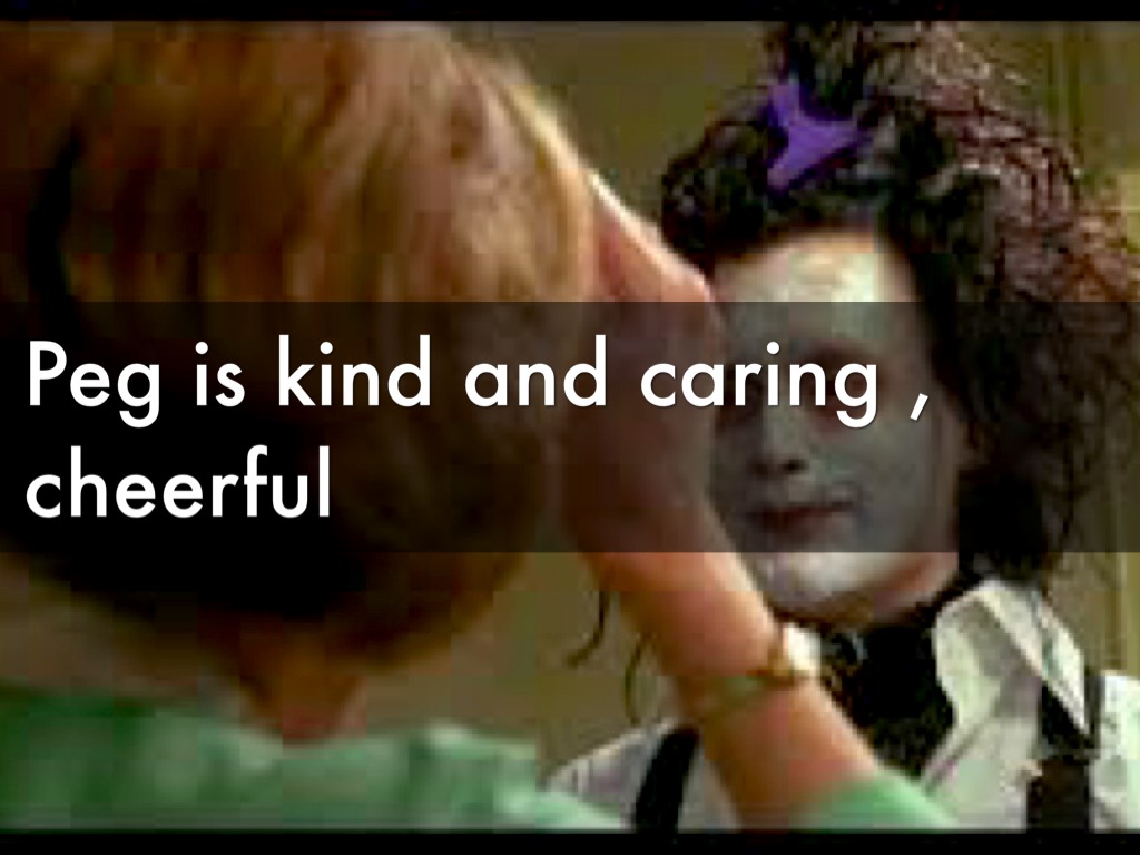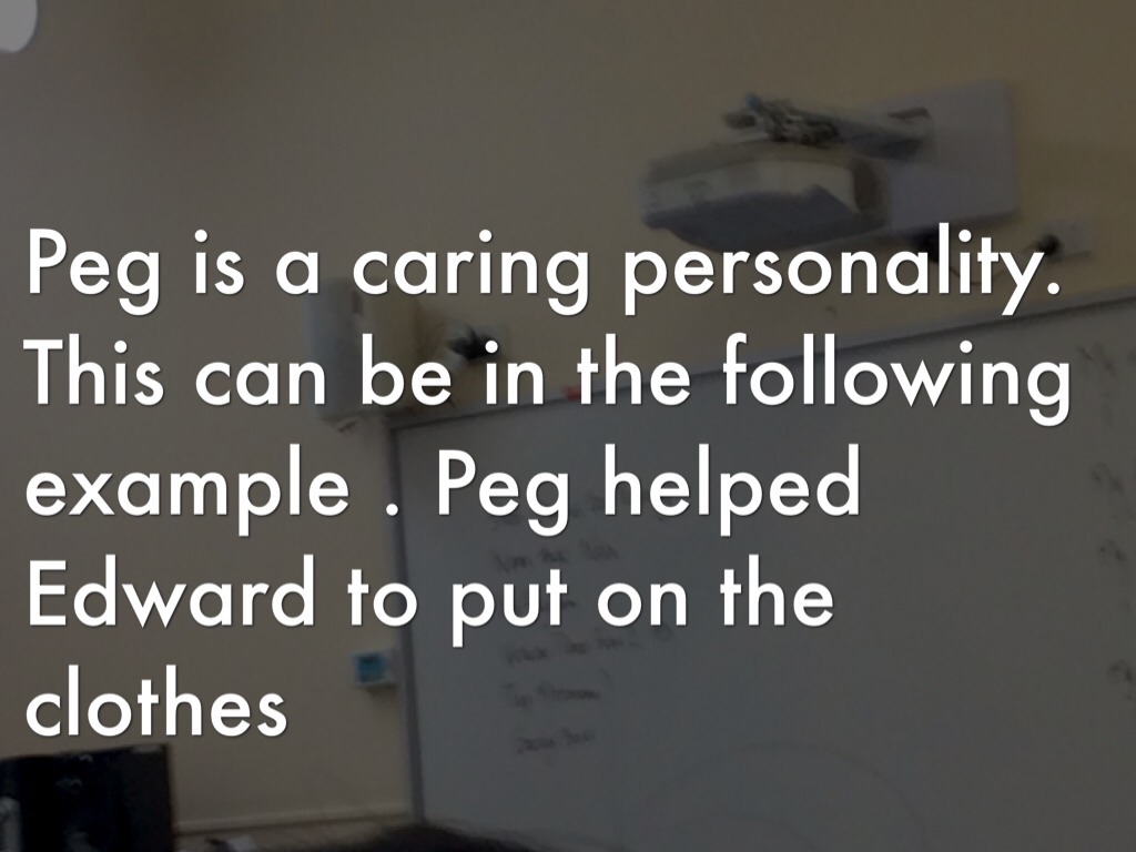 Peg is a caring personality. This can be in the following example . Peg helped Edward to put on the clothes