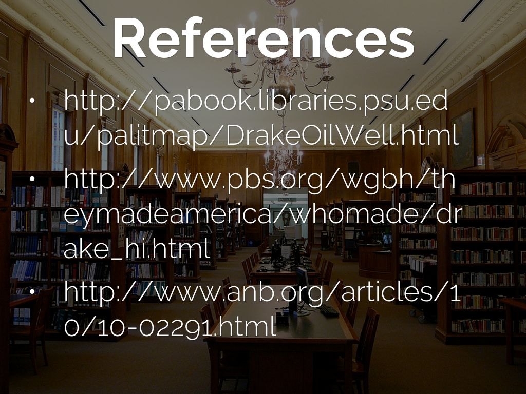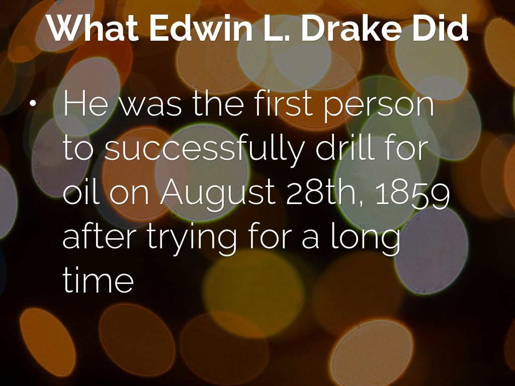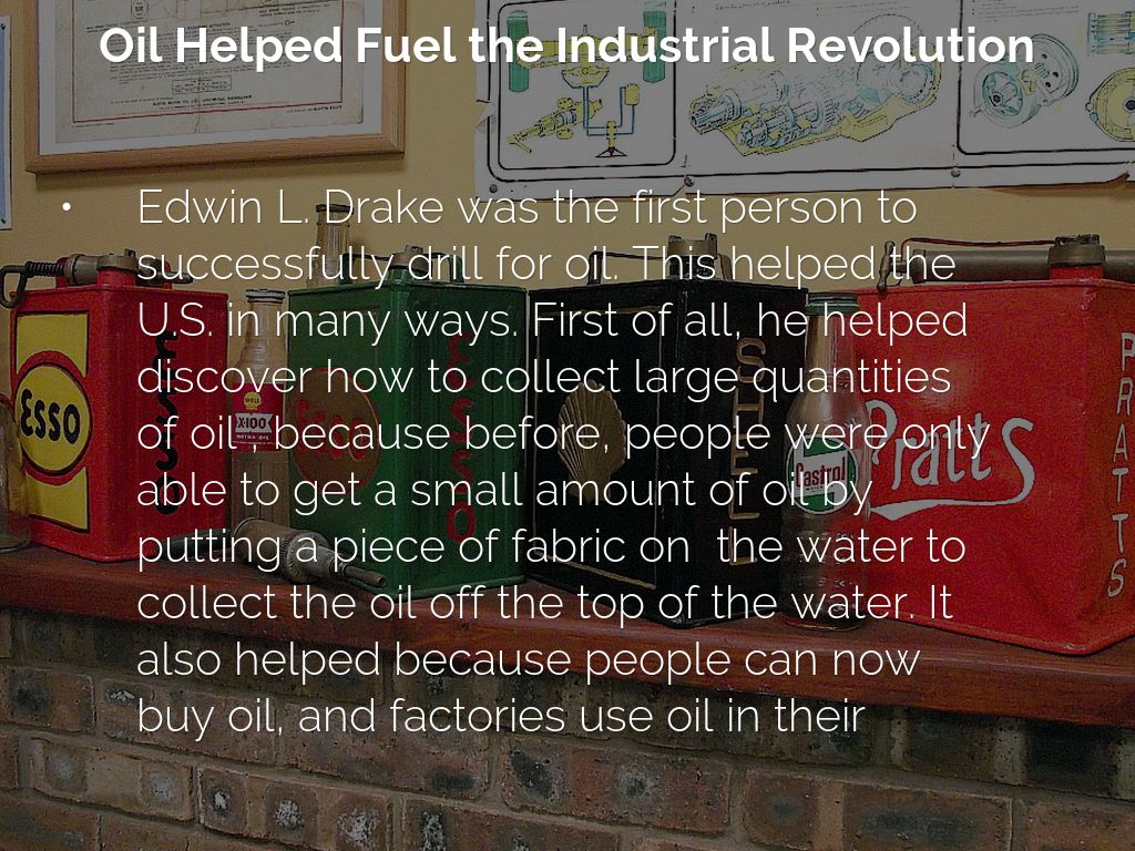 Edwin L. Drake was the first person to successfully drill for oil. This helped the U.S. in many ways. First of all, he helped discover how to collect large quantities of oil , because before, people were only able to get a small amount of oil by putting a piece of fabric on the water to collect the oil off the top of the water. It also helped because people can now buy oil, and factories use oil in their