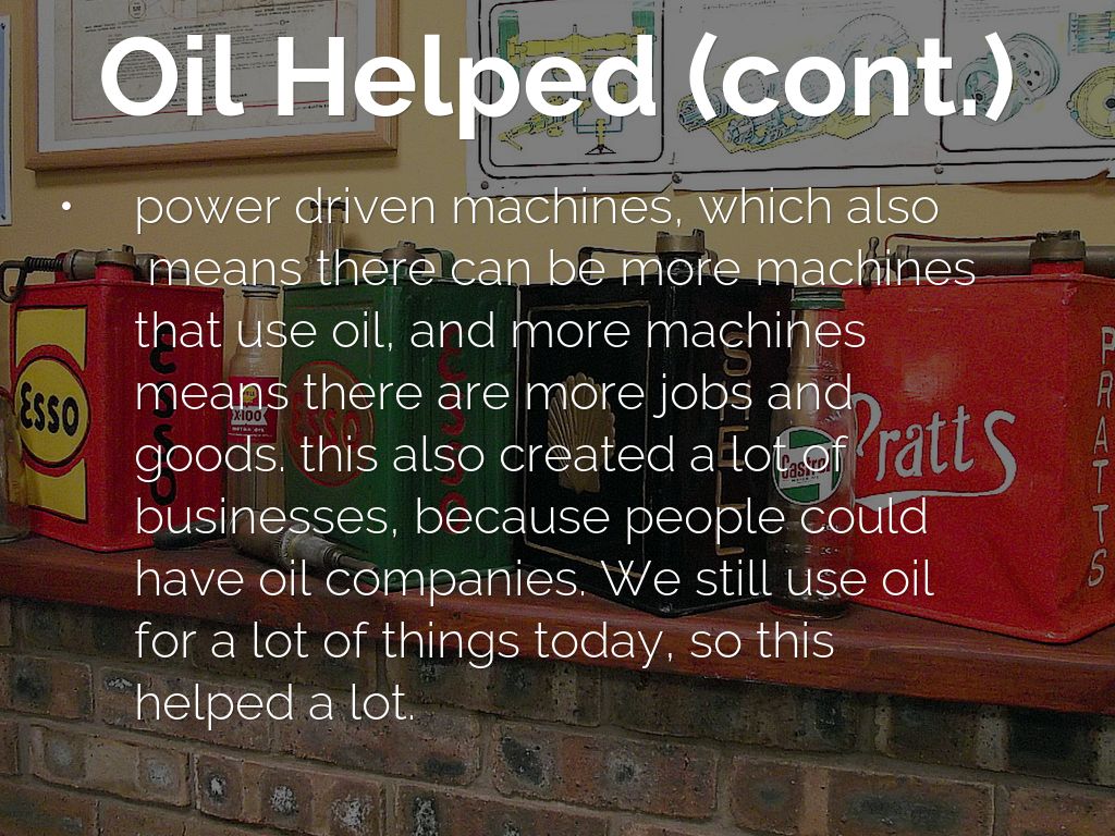 power driven machines, which also means there can be more machines that use oil, and more machines means there are more jobs and goods. this also created a lot of businesses, because people could have oil companies. We still use oil for a lot of things today, so this helped a lot.