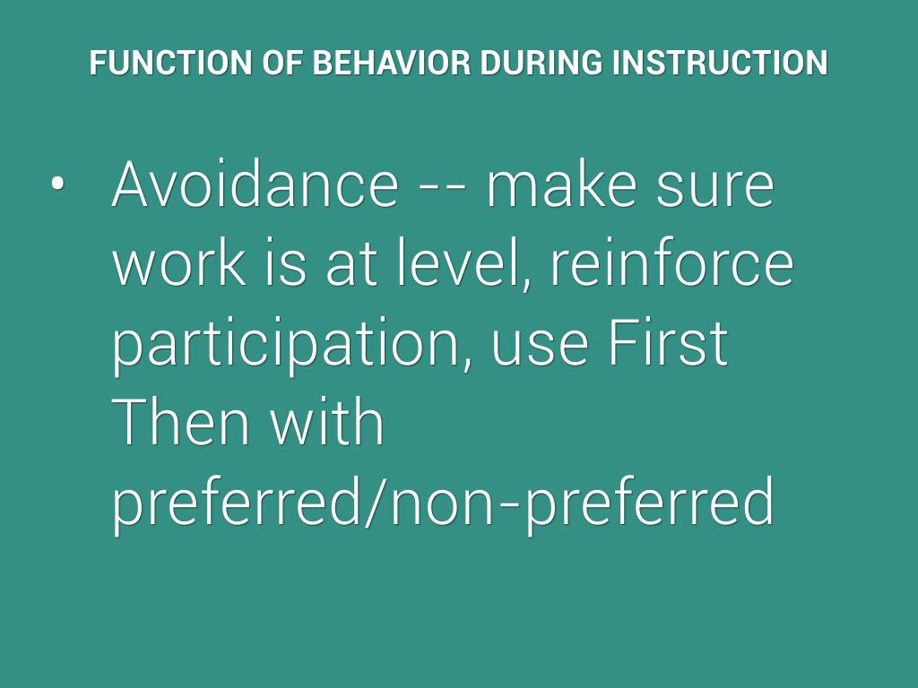 Avoidance -- make sure work is at level, reinforce participation, use First Then with preferred/non-preferred