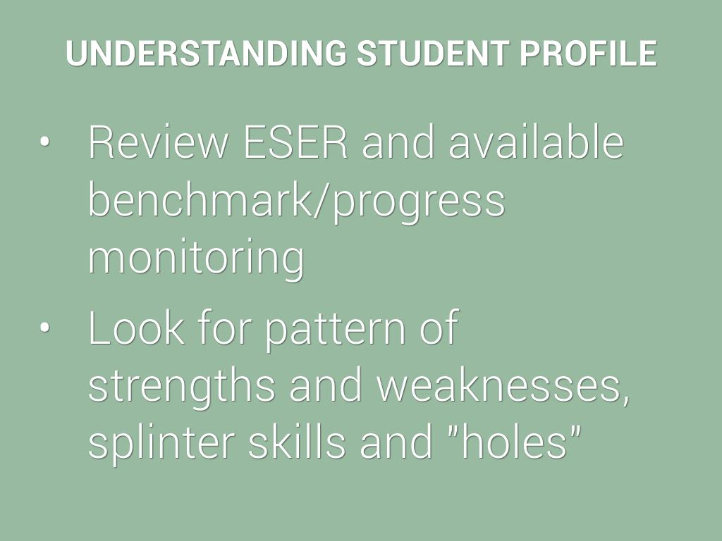 Look for pattern of strengths and weaknesses, splinter skills and "holes"