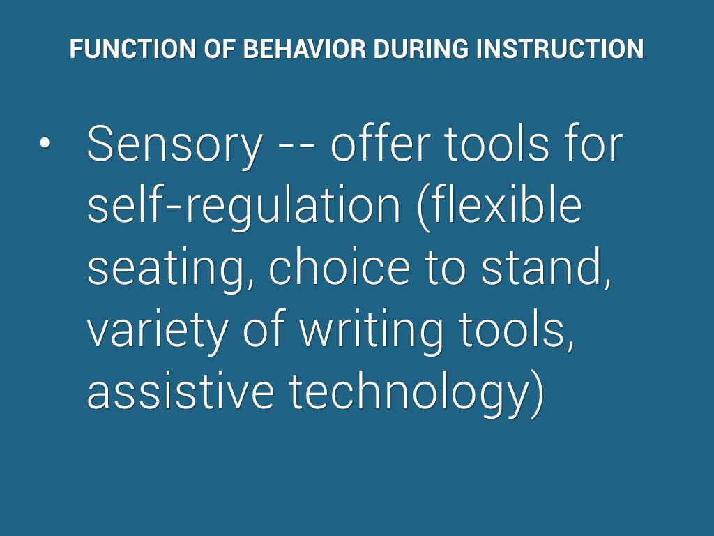 Sensory -- offer tools for self-regulation (flexible seating, choice to stand, variety of writing tools, assistive technology)