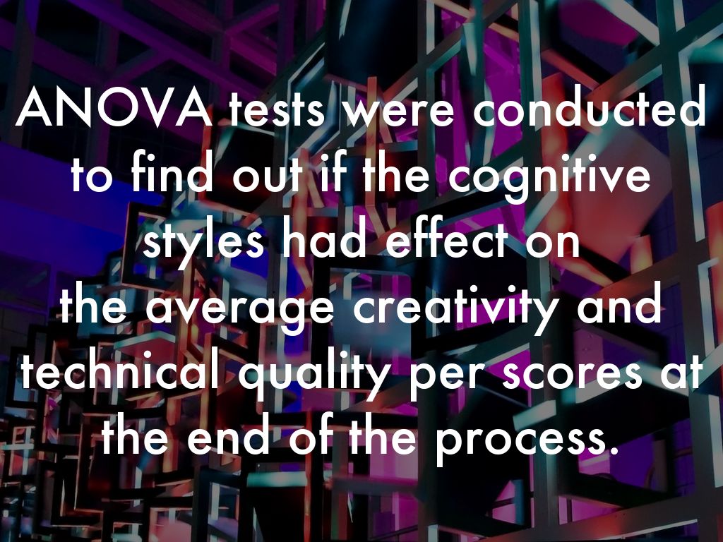 ANOVA tests were conducted to find out if the cognitive styles had effect on the average creativity and technical quality per scores at the end of the process.