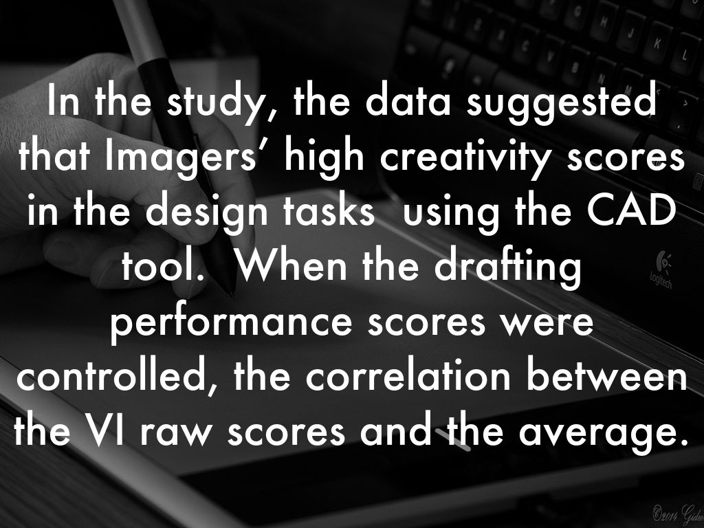 In the study, the data suggested that Imagers’ high creativity scores in the design tasks using the CAD tool. When the drafting performance scores were controlled, the correlation between the VI raw scores and the average.