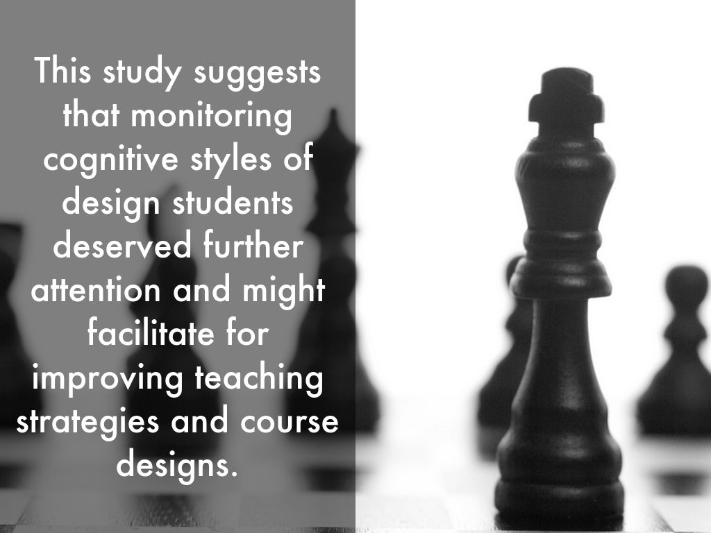 This study suggests that monitoring cognitive styles of design students deserved further attention and might facilitate for improving teaching strategies and course designs.