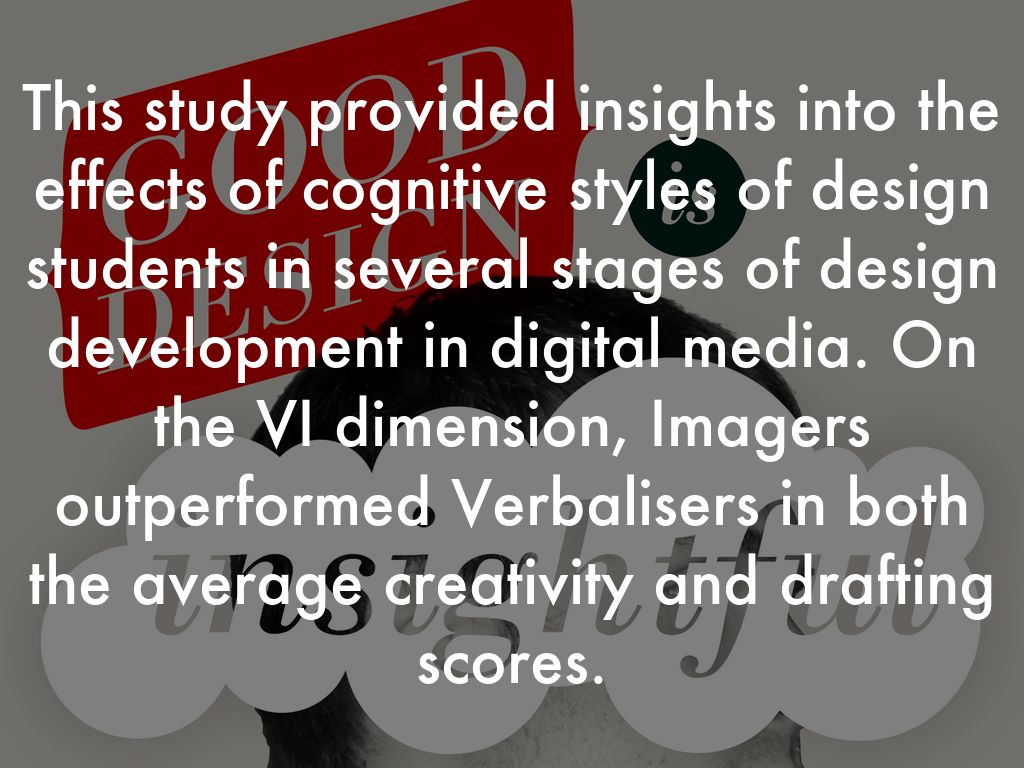 This study provided insights into the effects of cognitive styles of design students in several stages of design development in digital media. On the VI dimension, Imagers outperformed Verbalisers in both the average creativity and drafting scores.