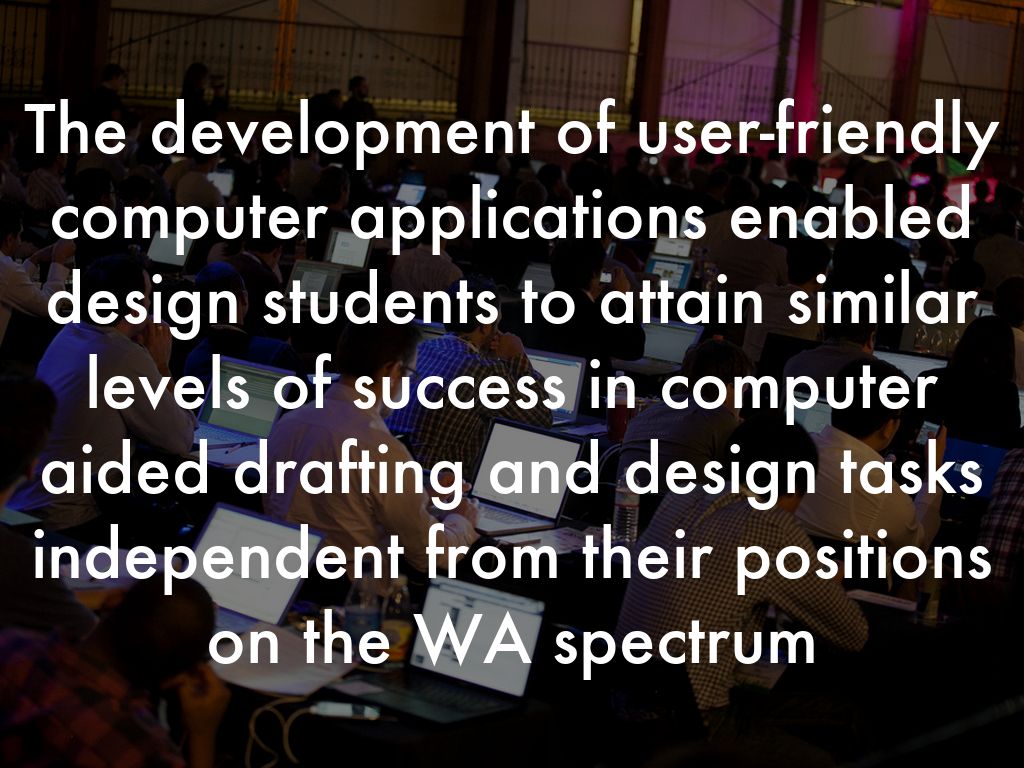 The development of user-friendly computer applications enabled design students to attain similar levels of success in computer aided drafting and design tasks independent from their positions on the WA spectrum