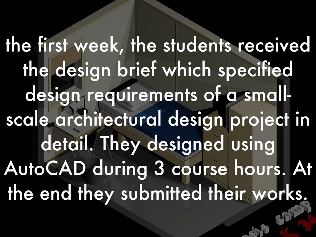 the first week, the students received the design brief which specified design requirements of a small-scale architectural design project in detail. They designed using AutoCAD during 3 course hours. At the end they submitted their works.