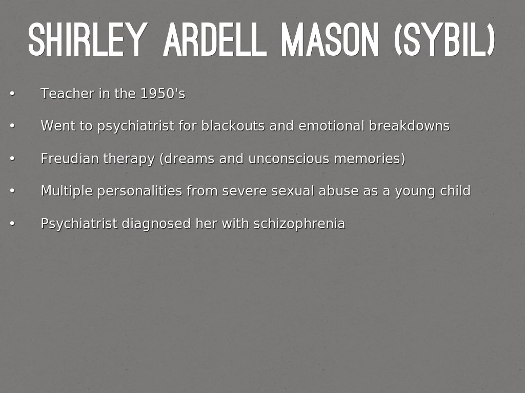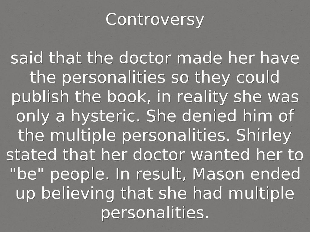 said that the doctor made her have the personalities so they could publish the book, in reality she was only a hysteric. She denied him of the multiple personalities. Shirley stated that her doctor wanted her to "be" people. In result, Mason ended up believing that she had multiple personalities.