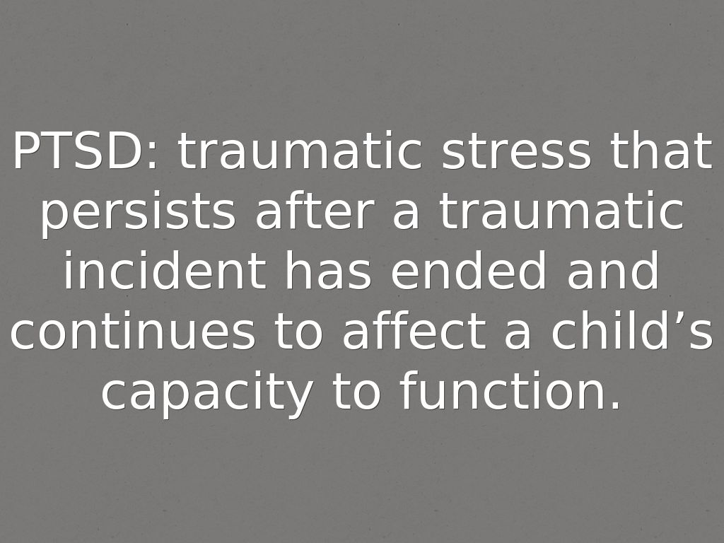 PTSD: traumatic stress that persists after a traumatic incident has ended and continues to affect a child’s capacity to function.