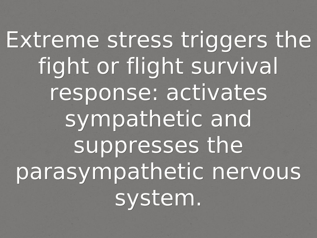 Extreme stress triggers the fight or flight survival response: activates sympathetic and suppresses the parasympathetic nervous system.
