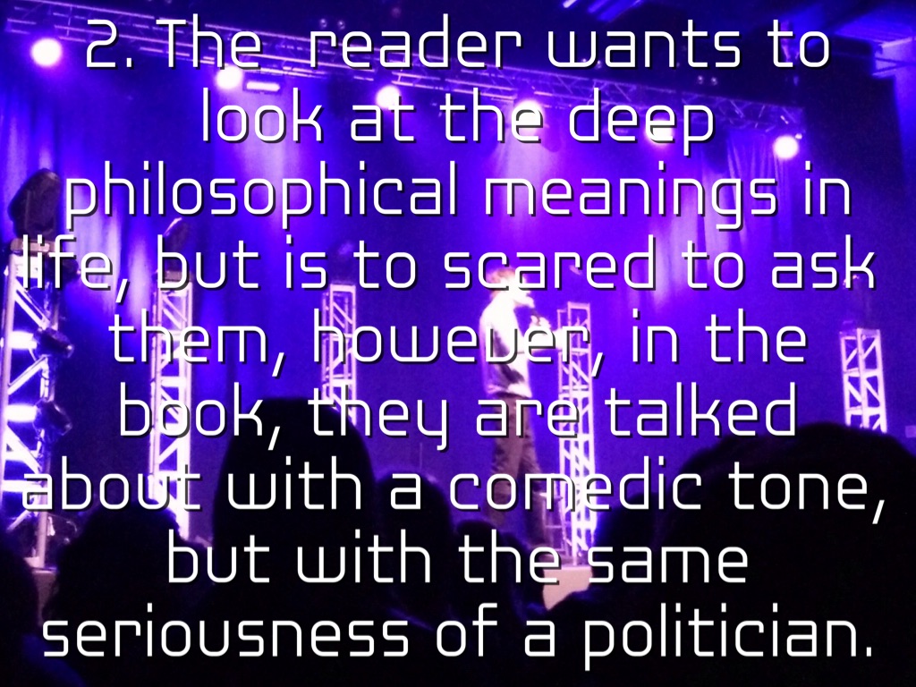 2. The reader wants to look at the deep philosophical meanings in life, but is to scared to ask them, however, in the book, they are talked about with a comedic tone, but with the same seriousness of a politician.
