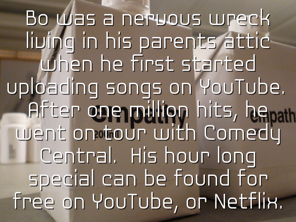 Bo was a nervous wreck living in his parents attic when he first started uploading songs on YouTube. After one million hits, he went on tour with Comedy Central. His hour long special can be found for free on YouTube, or Netflix.